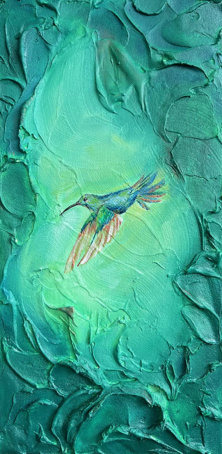 Hummingbirds buzz around me as I paint on my Santa Monica, California balcony. They are a constant source of joy and inspiration. This piece has many layers of molding paste and paint building up tactile texture and a magical atmosphere. Catharsis's background technique is influenced by my Ocean S...