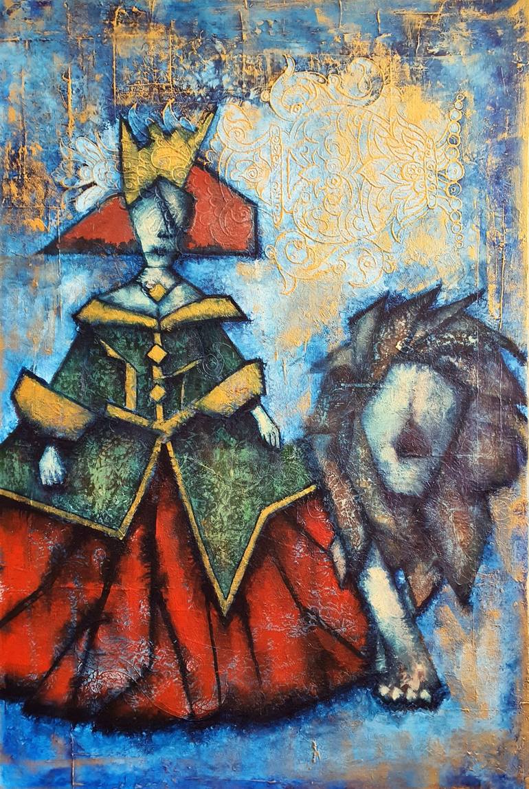 Catherine the Great Empress of Russia. Bold floral in background covered by golden shades. Cubism and abstract.