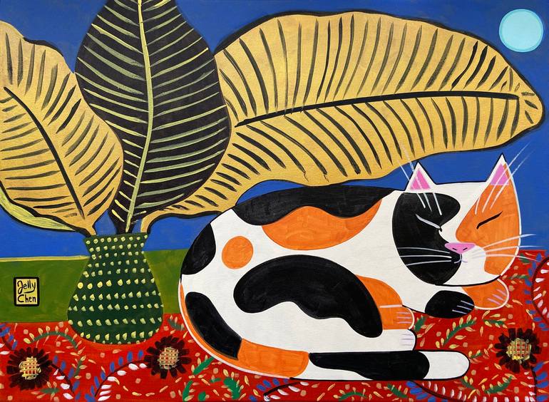 'Catnap' is an acrylic painting on canvas, inspired by bold patterns, exotic fabrics, and peaceful sleep. The painting continues on the sides, so once stretched, framing is not necessary. It is signed on the front, and signed, titled and dated on the back of the canvas. The painting will be carefull...