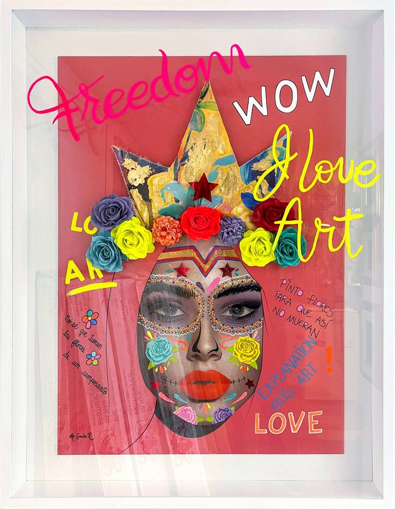 Technique: Couture on Canvas. María Camila interprets the canvas as a mannequin and develops her work from the fashion industry. Giving life to Art pieces with techniques of Haute Couture with assemblage of rhinestones, Swarovski crystals, textiles and appliqués, creating a layer of textures that stands out from the figurative illustration of its base.