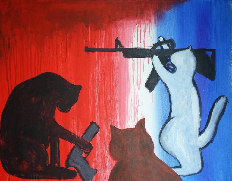 This artwork portrays three cats set against a striking background divided by red on the left and blue on the right, with a white stripe down the middle. The cat on the left is black and is holding a handgun, seemingly contemplative. In the center, a reddish-brown cat sits and faces away, partially ...