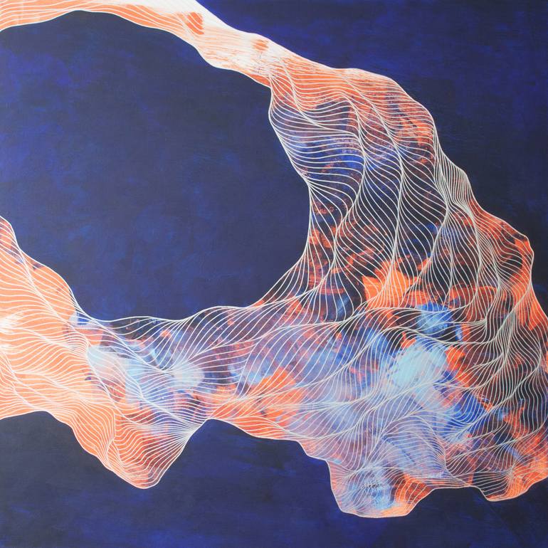 This is an experiment in color- the bright orange is new and bold and became a great contrast to the blue. The shape is a bit oblong and intriguing, calling to mind any natural form that is inherently strange, and yet lovely in its composition. I also love thinking about what happens past the canvas...