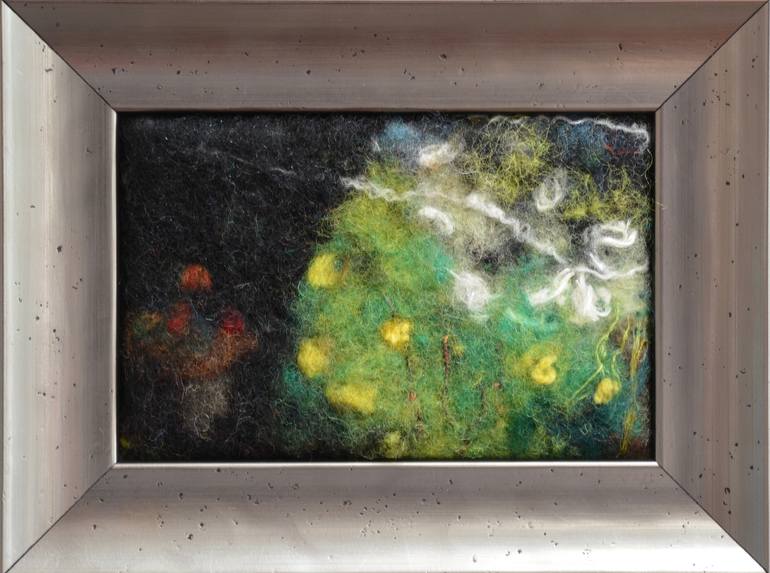 Feltpainting made with wool.colorful and warn and natural texture. The style is abstract expressionism.
