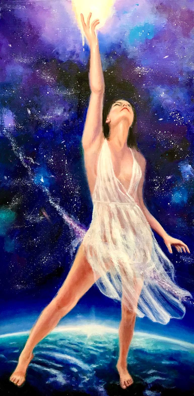 A young woman is reaching out to the sky to seize a bright shining light. Her feet are firmly grounded on the earth connecting her body from the earth to the universe. This is a metaphoric and inspirational depiction of a female realizing their sacred mission on earth. This can be inspirational for ...