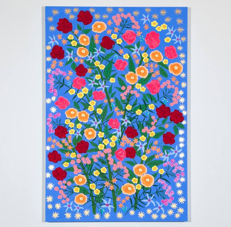 This work is part of the "Mystical Rose" series. Exploring themes of Guadalupe, these paintings are a tribute and honoring of my late Mom. These paintings expand on the floral fields and bouquets synonymous with my style. Guadalupe is present in this series through the blue of her cape, gold stars a...