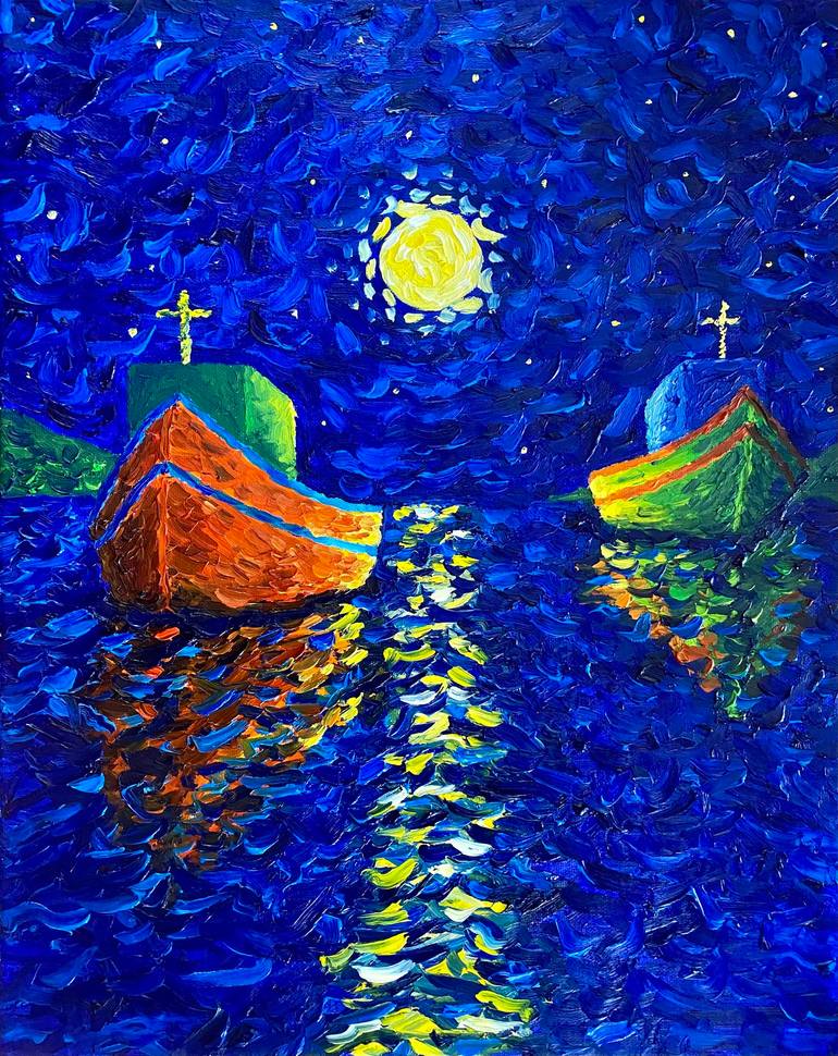 This painting produced during September 2023 was created from imagination and depicts a scenery featuring two Greek fishing boats anchored within a bay captured at night whilst a full moon is on display. I wanted to create a sense of movement in the picture which was achieved by the composition and...