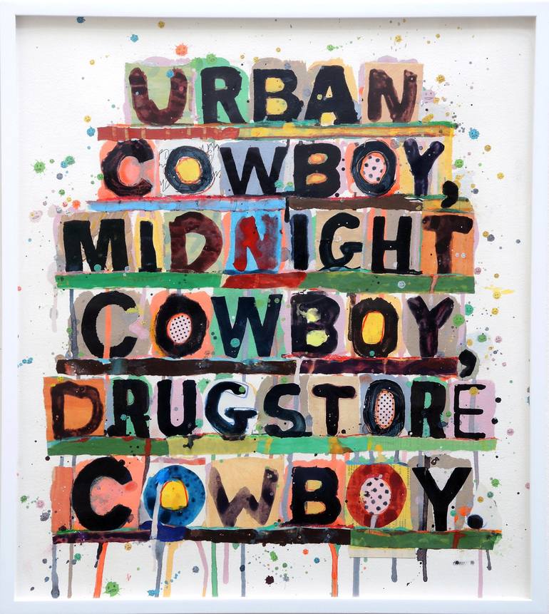 My love of lists, patterns, typography, and movies come together in "Celluloid Cowboys". Celebrating three iconic movies with "Cowboy" in the title, "Celluloid Cowboys" will make a fun addition to your home screening room or man cave! Made with acrylic paint, paper collage, water crayons, and ink on...