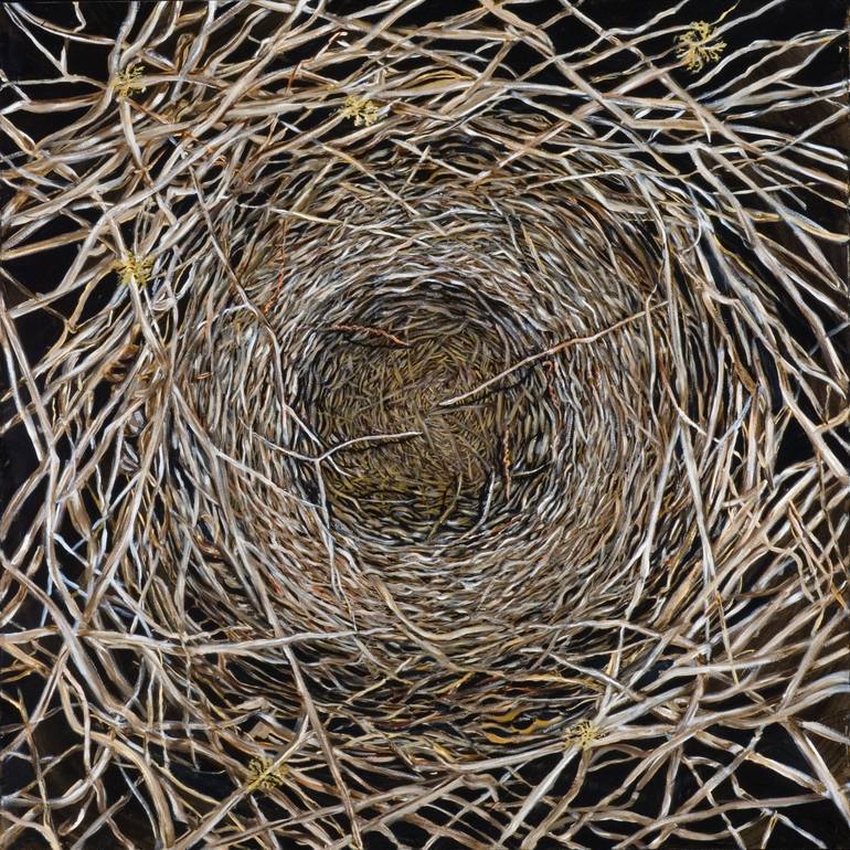 This nest fell from a tree in a friends yard. It felt fortuitous and became a metaphor for a time in my life of nesting and the nest emptying. I exaggerated the outward edges which seem to be coming apart as the center stays together fast and strong.