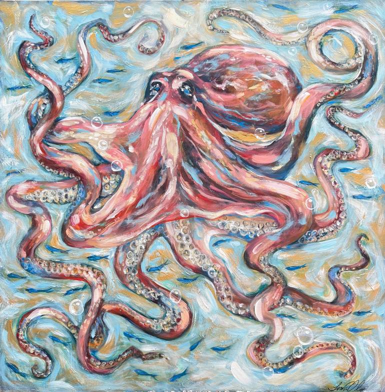 Started by painting the octopus in black and whites. Then added numerous thin layers of transparent colors mixed with glaze. Many layers of metallic golds and irridescent colored glazes give the water a unique appearance. AS you walk by the painting the layers change and are intriguing. “Cephalopod ...