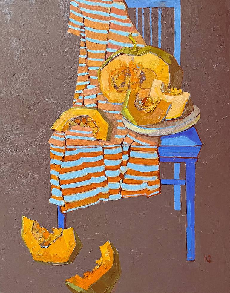I found a pumpkin. This is a Chinese traditional Kabocha pumpkin. Its shape is unusual. This pumpkin looks like a horseshoe. It means it brings happiness. What an amazing color. Even in cloudy weather. What was I thinking? I thought about the beauty of line, about the rhythms of color. I thought abo...