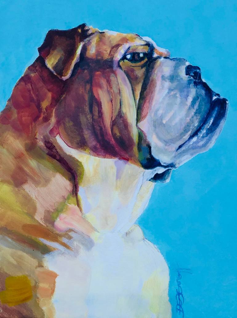 Inspired by a hansom winner, a pure bred. Champion Bulldog. A stunning coat showing autumn colours. A proud creature full of strength and character. I hope you will be captivated by the power of his presence. Such a poised profile, the vivid colours bold and bright designed to draw you in. The medi...