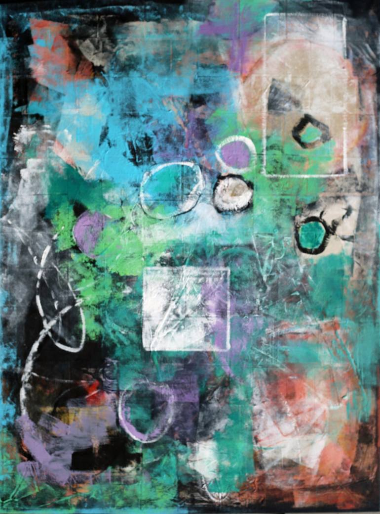Looking closely at "Chaos and Order," the viewer can see the initial layer of handmade papers. This layer adds background structure, texture, depth, and interest. The cool green in this painting evokes a sense of nature, while the blue and green bring a feeling of calmness. As the focal point, the s...