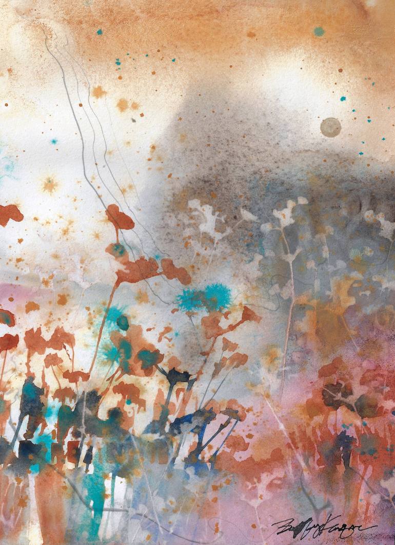 Capturing the California wild, which is covered in chaparral that stretches from Southern Oregon to Baja Mexico. Paper was prepped with floating inks, creating bands of charcoal wisps. Chaparral painted in ultramarine, sienna, magenta, sepia and cobalt teals. The grasses and crowns painted directl...