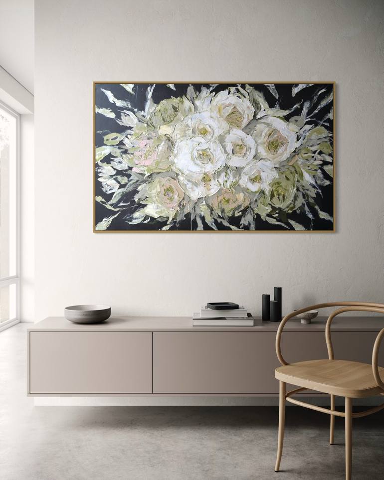 Video review: https://youtube.com/shorts/S4wJ6q8x844?si=h0c6bMRdaR3kABZQ On a dramatic black canvas, acrylic flowers burst forth with vitality, shaped by the bold strokes of a palette knife. The color palette, a delicate interplay of white, soft green, and beige, imbues the artwork with a sense of ...