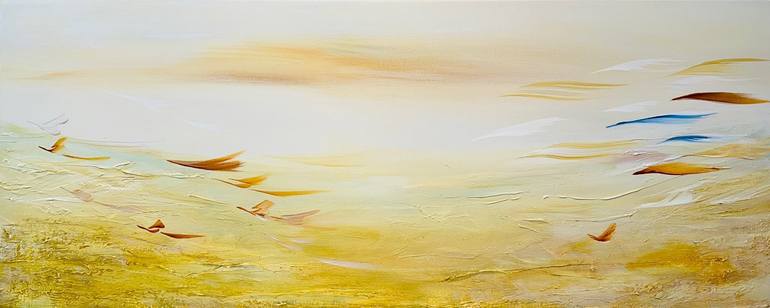 This painting captures a serene and uplifting mood with its warm golden tones and flowing brushstrokes. The textured foreground suggests a natural landscape, while soft, abstract shapes evoke movement, resembling birds in flight or waves of energy. Subtle accents of red, blue, and white add depth an...
