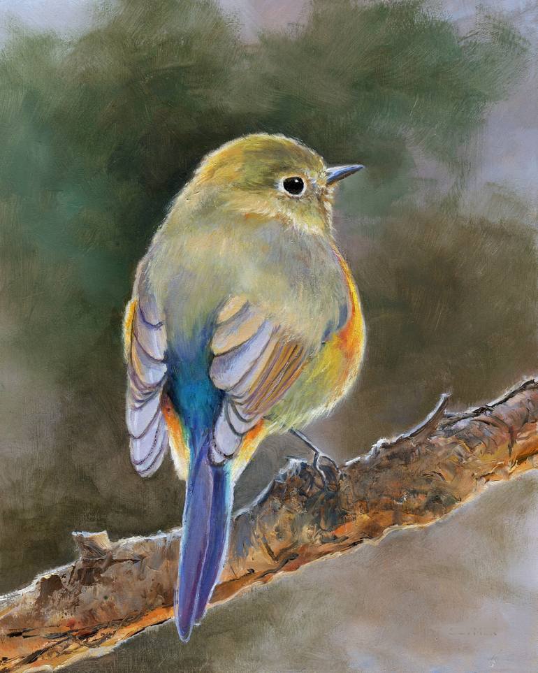 This painting features a small bird perched delicately on a branch, rendered with soft colors and intricate detail. The bird’s plumage showcases a harmonious blend of yellows, grays, greens, and hints of blue, creating a lifelike and textured appearance. The background, composed of muted hues, subtl...