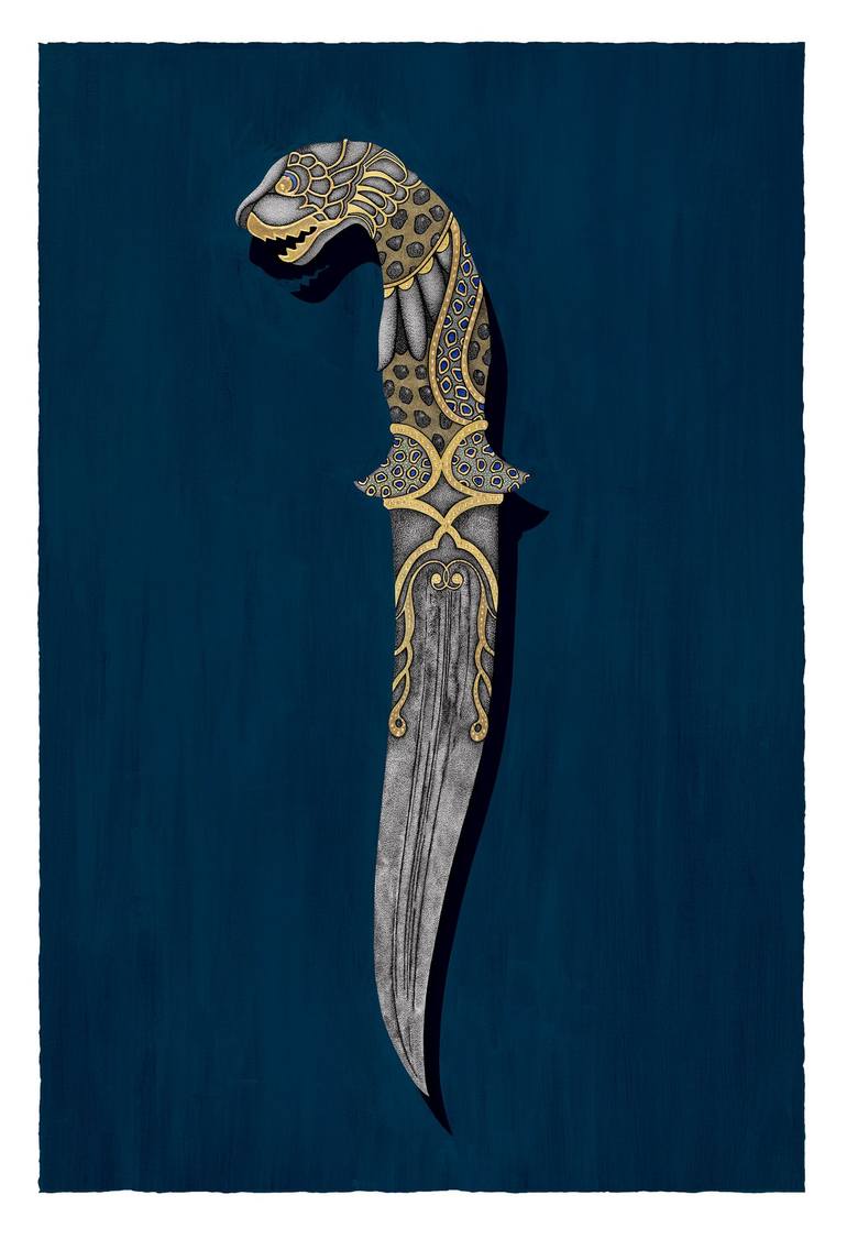 Freehand ink Stippling work with gold painted embossed patterns. PAPER SIZE : 18” x 26” FRAMED: 25” x 33” Statement: With the new works, Daggers, Cards and the Elephant, York is taking us back to her earlier pieces with more attention put into colors and patterns. They all belong to the same “...