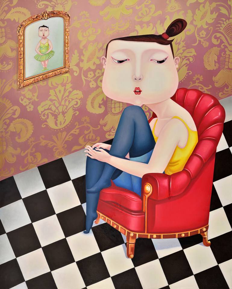 “ Cherish the Memory of Her First Prize “ Oil on canvas 2014 A beautiful girl is sitting in a red chair, the time when she first won a ballet dance award came rushing back. On the background of the picture hangs a photo frame, showing a scene of the girl's first victory. At that young age she stil...