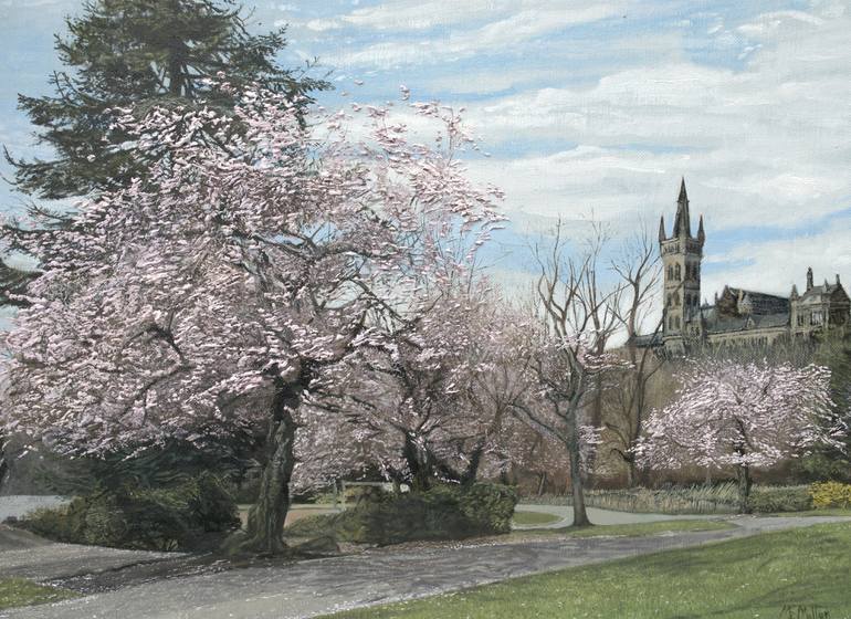 This is a view in Kelvingrove Park, in Glasgow, with the George Gilbert Scott, university building, in the background. I have always been fascinated by the brief, but fantastic spectacle, of cherry trees in flower. Artistically, I'm interested in the technical challenge of depicting them and intri...