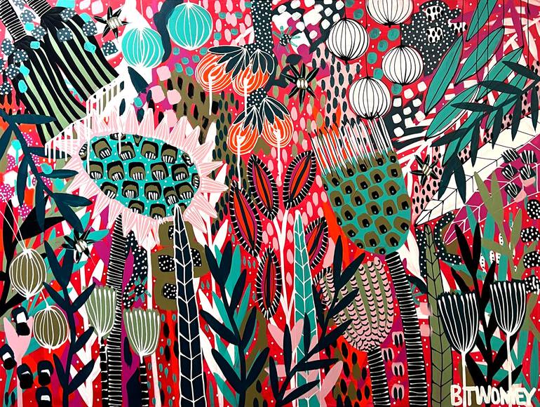 Vibrant and joyous! A sensationally bright blue and pink mix of happy layers! Botanical shapes harmoniously painted into a fabulous tapestry of colour! Australian flora inspired. This painting comes framed in an Australian hardwood float frame in either black or blonde. Frame is included in the pr...