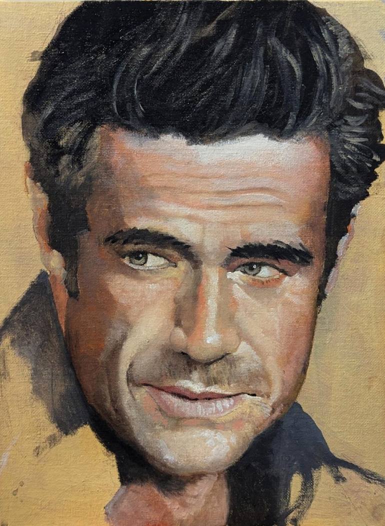 A contemporary portrait style rendering of a man against an ochre background. Featuring an expressive pose, strong lighting and a neutral palette.