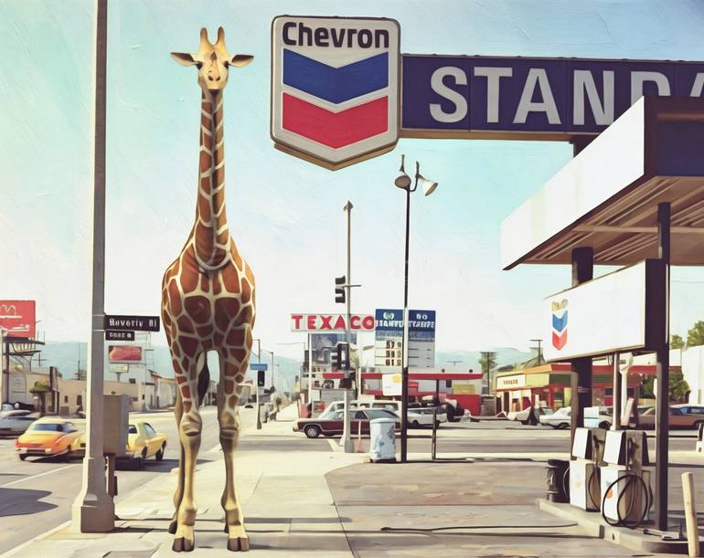 Creation by Mr. Strange. Jean-Marie Gitard, aka Mr. Strange, is a French digital artist who uses surrealism with a certain derision. A renowned artist, he is featured in numerous collections in France and abroad. Chevron Gas Station / Oil painting on canvas / 2020 Unstretched on a frame (unframe...