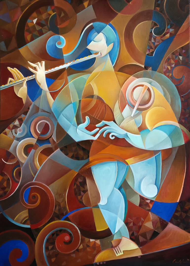 In un dipinto ho unito gli interessi di questa giovane coppia, la musica e lo sport. I tatuaggi del ragazzo si trasformano nei tasti del flauto e il movimento si trasforma in musica. ----------------------------------------------------------------------------- In a painting I combined the interests ...