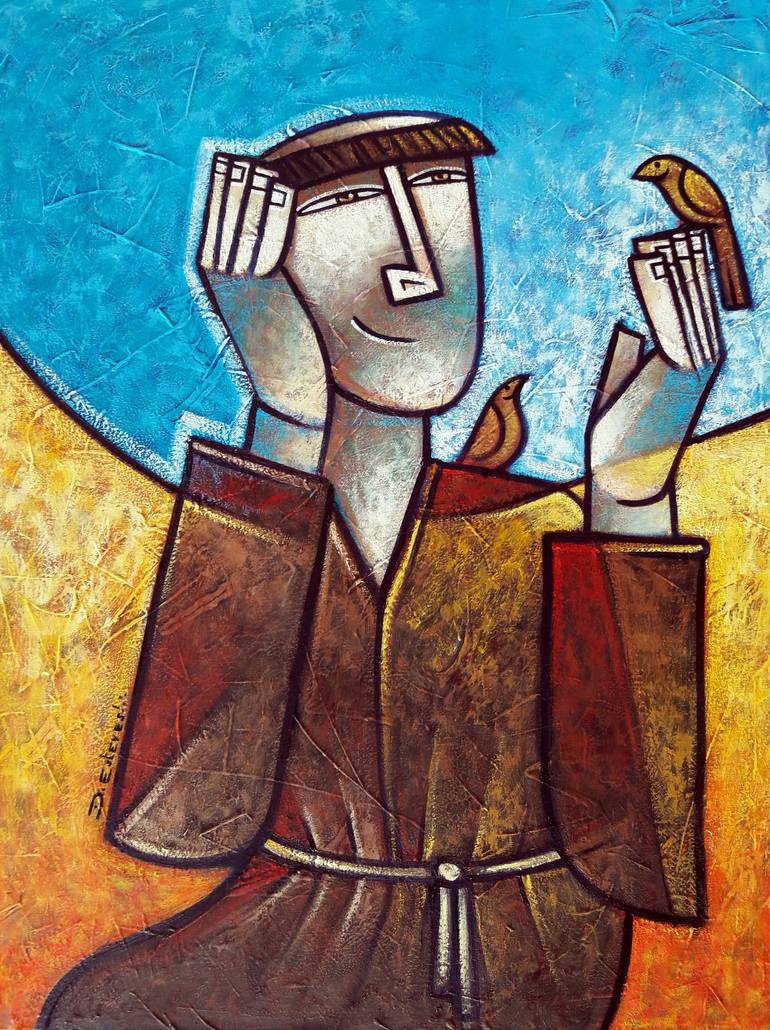 This canvas is inspired by St. Francis of Assis, a character that has inspired me on other occasions because of his loving and protective relationship with animals. As my art talks about the good things in life and tries to emphasize the joy of living, this is a very interesting character to portray...
