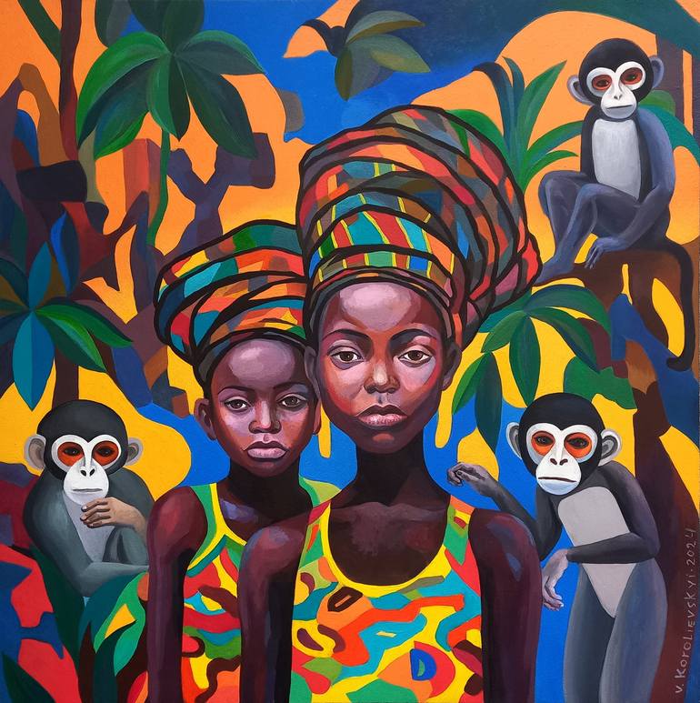 In this vibrant acrylic piece, I've embraced the bold hues and emotive brushstrokes characteristic of fauvism, intertwined with a naive charm. My intent is to evoke a deep connection between human innocence and the pure essence of nature. The intimate bond between the figures and the monkeys suggest...