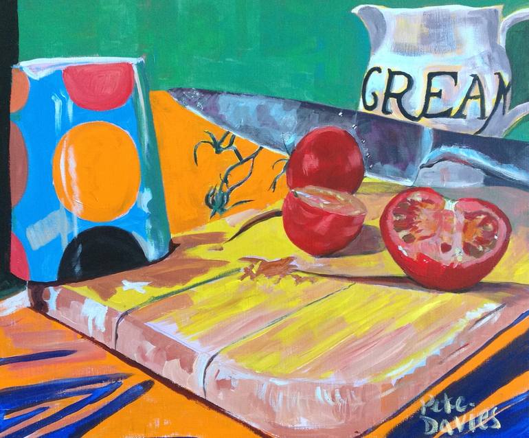 This is my second painting in acrylics on linen. I enjoyed the immediacy not found in traditional oil painting which is my usual style. It is another joyous, simple celebration of colour to brighten up any kitchen wall.