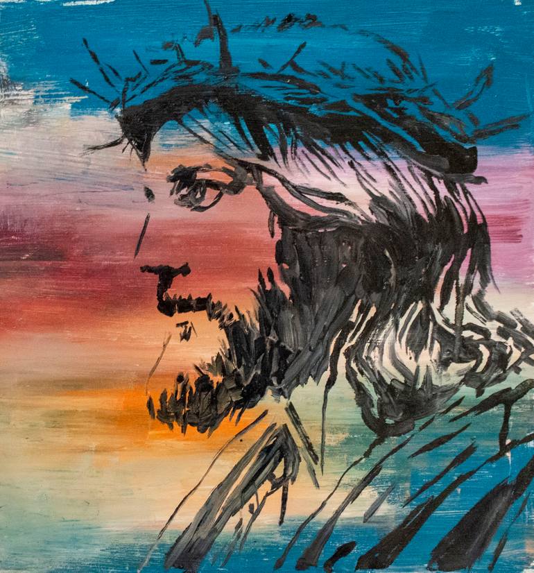 This painting portrays a striking profile of Jesus Christ wearing a crown of thorns, rendered in bold, expressive black brushstrokes that contrast sharply against a vibrant gradient background. The hues of orange, pink, and blue, reminiscent of a radiant sunset, evoke both warmth and solemnity, symb...