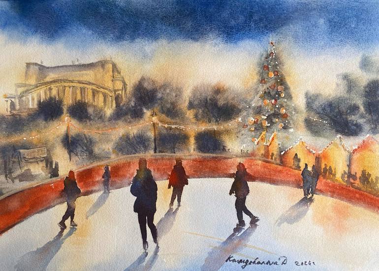 "Christmas Mood, Ice Rink" is a picturesque watercolor painting depicting a festive ice rink adorned with Christmas decorations, with the iconic Yerevan Opera House in the background. This piece is part of a series that captures the charm and beauty of Yerevan, reflecting the city's unique character...