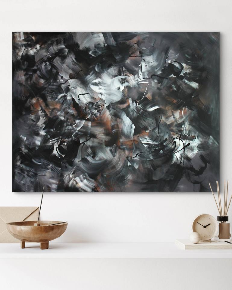 "Chromatic Symphony" is a bold and dynamic large-scale abstract painting that embodies movement and harmony through its fluid composition. Layers of grey, black, and white blend seamlessly, creating a striking interplay of light and depth. Painted with acrylic on canvas, this statement artwork exude...