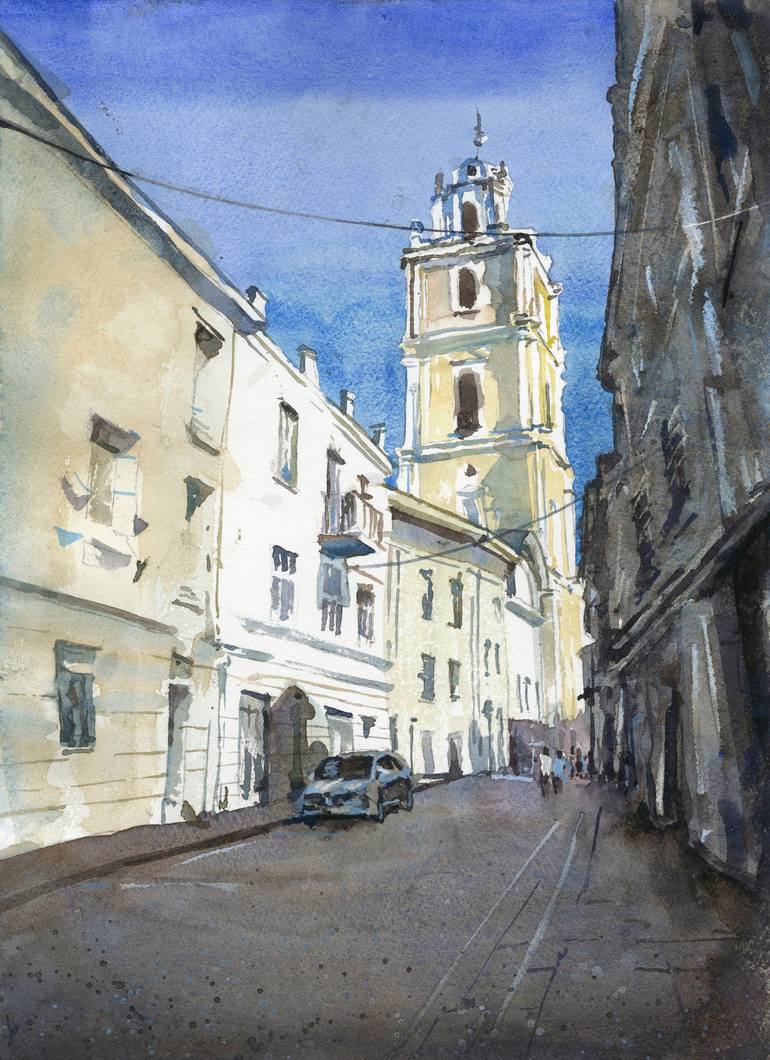 Church bell tower in Old Town Vilnius Lithuania travel essentials art for home cityscape architecture 11x15" watercolor on 140 lb professional watercolor paper. Hand signed by artist. Unframed. Painted by artist Ryan Fox. Ryan Fox is a signature member of the American Watercolor Society as well ...