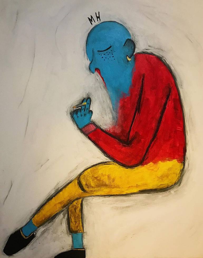 This expressive painting features a blue-skinned figure with a pensive expression, seated against a minimalist background. The character, dressed in a red shirt and yellow pants, holds a cigarette in one hand. The use of bold colors and simple lines evokes a sense of introspection and melancholy, in...