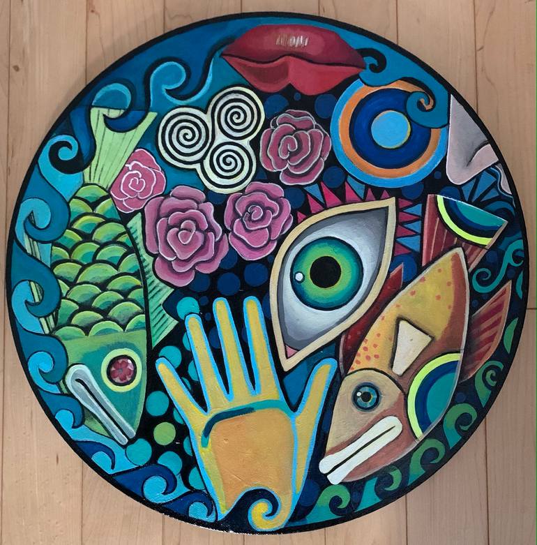My favourite symbols of fish (growing up), eye (self reflection), mouth (being female) and hand (greeting others) reappear in many of my art works. The circle canvas was a new shape for me which inspired the movement of the waves.