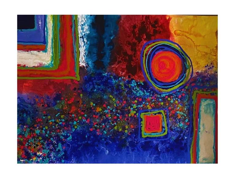Circle Game is part of my Laurel Canyon Series. Art inspired by Music. Circle Game has a very intense bright palette designed for a very white and gray modern home. Circle Game is meant to be a Pop of Color on a white wall. I think it succeeds with its intense and very fun color palette.