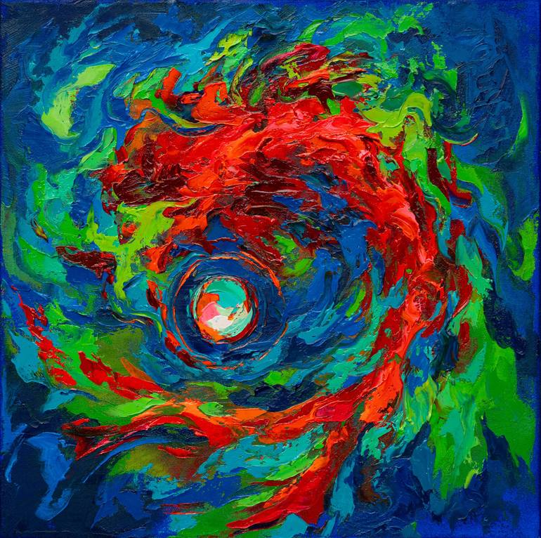 I wrote this work as a study of movement — not physical, but internal. There are only three colours: red — pulse, blue — depth, green — calm. Together they rotate in a circle that never closes, like a thought returning to itself. Some may see a goldfish, others a pond at sunset, and still others a ...