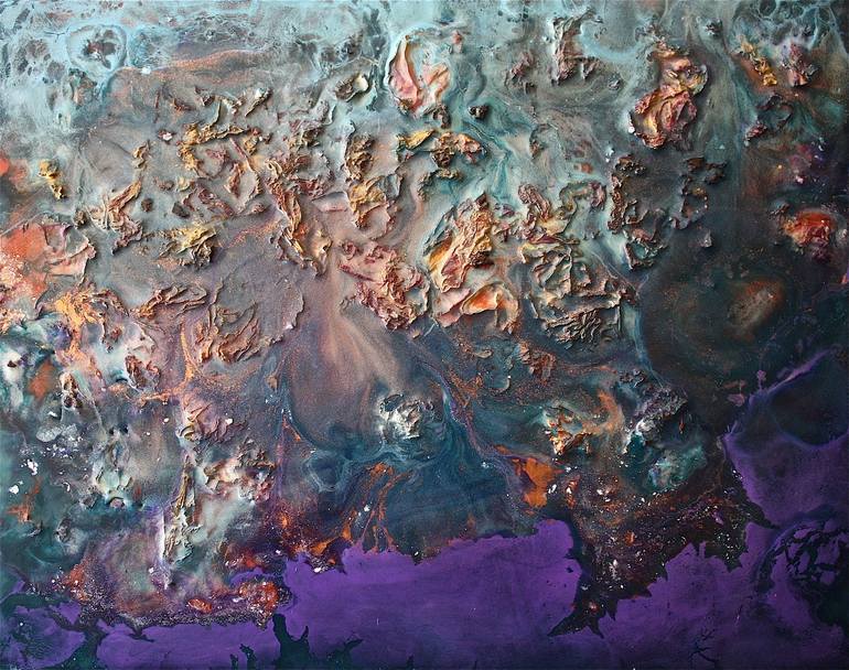 I've been inspired by satellite images of Earth as the planet turns from day to dusk to night and the cities begin to light up. This is a mixed media piece because what appears to be mountains is made by using dried rose and peony petals (from my garden). A pearlized aqua powdered pigment is used i...