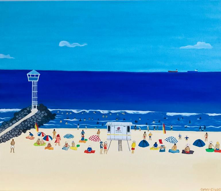 This is a painting of my favourite beach where I go to body surf. I wanted to paint a bright and simple painting in a naive style.
