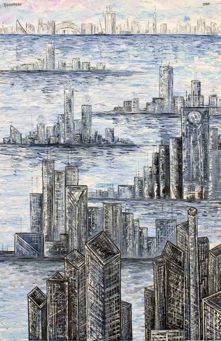 "City Ships" is an all knife painting, the surreal seascape of ships simulate the city life on water as on land.