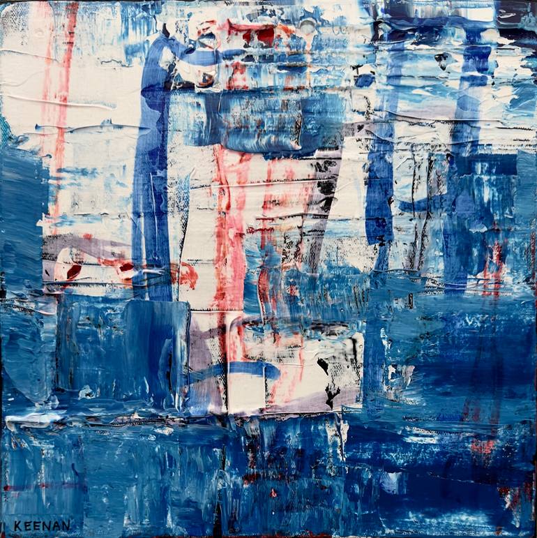 This painting is a modern take on the hustle and bustle of New York City. A myriad of textures have been playfully arranged, juxtaposing heavy acrylic paints with expressive lines from red, blue and black Sharpies to create an abstract depiction of buildings standing proudly atop early morning rippl...