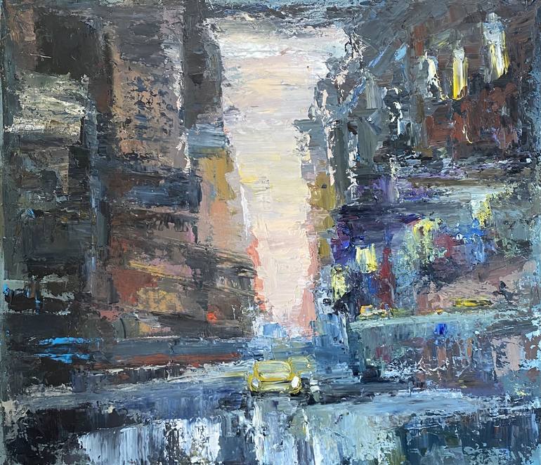 Used Materials: Oil, canvas, easel,palette knife. Inspired by evening it the city after rain.