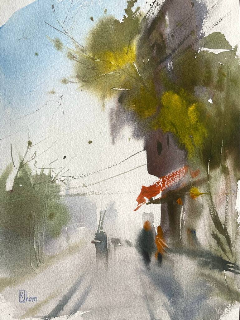 Summer cityscape painted from life. Quiet, calm city corner with a cafe. Watercolor made using wet technique.