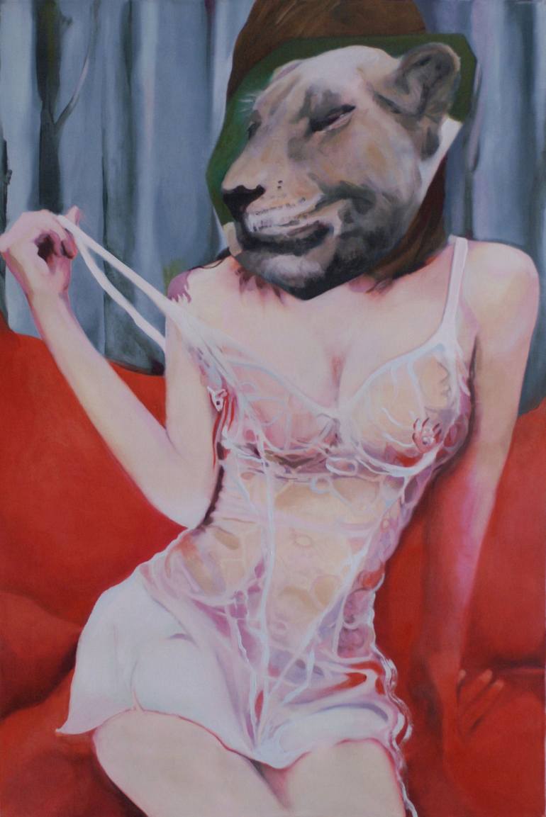 "Price: $365 – $16920 | 70 works available" I live in Brussels, I am a painter and painting teacher at the Academy of Fine Arts. The subject of my artworks is existentialist portrait, identity . In my paintings, the eyes are most often masked or unworked if you prefer. A theme as the hybridization of commercial and popular images drawn from the media and copy-paste for the realization of portraits such as evocations. The masks, here are made as pseudo-collages ( “pretended” cut collage but painted) The mask is a recurring motif, symptom, anachronistic displaced thing. It is a conceptual reminiscence. Mask is something, a form, that returns through cultures and ages and survives its own death. There is something pathetic about the masks which are like “capable of anything”. Painted as a collage in the artwork it creates a particular spatiality, enhancing the geology of the construction and the mutating aspect of someone as well. Combining intimism with hyper-mediated production, abstraction and figuration, the gesturality of pasta and the almost watercolored descriptive form.it highlights the construction assembly of various faces, various aspects of someone. From time to time a thick gestures of paint paste, traces; pink or black impasto, symbolic on a deliberately very fine, airy and flat material. The gesture erasing the eyes transforming the face in an effigy . Elsewhere, an insulating invading space, of almost monochrome colors, enveloping the subject, the background and the figure becoming entangled with a sort of melancholy . Appearance, identity, the subject is elsewhere, beyond representation. Colorful flowers , animals furs as playful figures surrounding and invading the human figure as a hope.