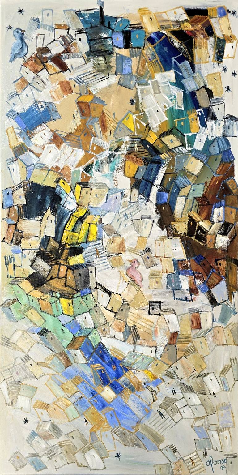 What I love about painting is that you can bring your ideas to life on the canvas. I can place the stars wherever I please, and the birds sing above the rooftops. This piece is very special, it explores a blend of colors that ultimately come together with a unifying thread, creating a sense of harmo...