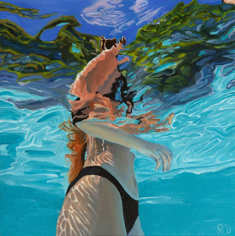 Clio is an original painting by Amy Devlin. My process starts with taking the photographs I work from, I like to experiment with angles and light in the photographing. Every inch of the canvas has multiple layers on to build up the feeling of light, water and body, every layer focusing in on more de...