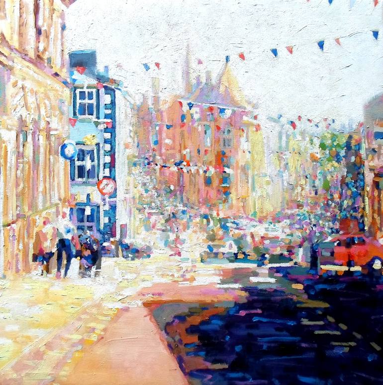 A view of the high street in Clitheroe on a sunny day. Oils on canvas. Varnished and signed on the front. Unframed.