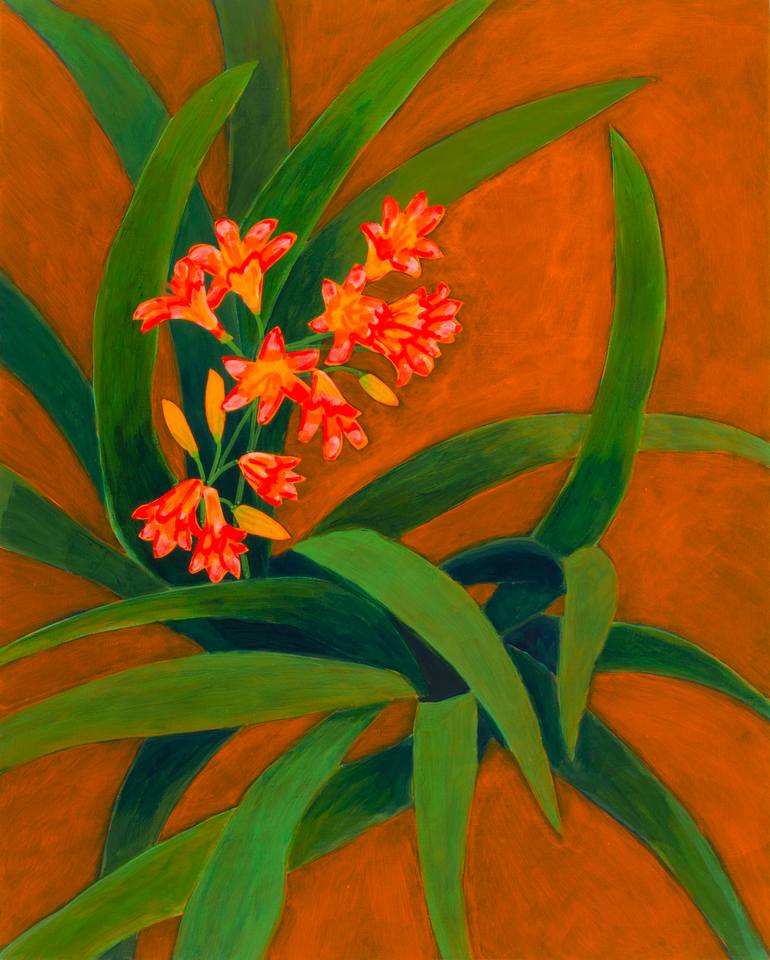 One in a series of four tropical floral paintings inspired by the landscape flowers of Cotepec Mexico. Painted on cradled wood panel, 1 1/2" deep, and sides are painted black. Titled, dated, and signed on the back, wired and ready to hang.