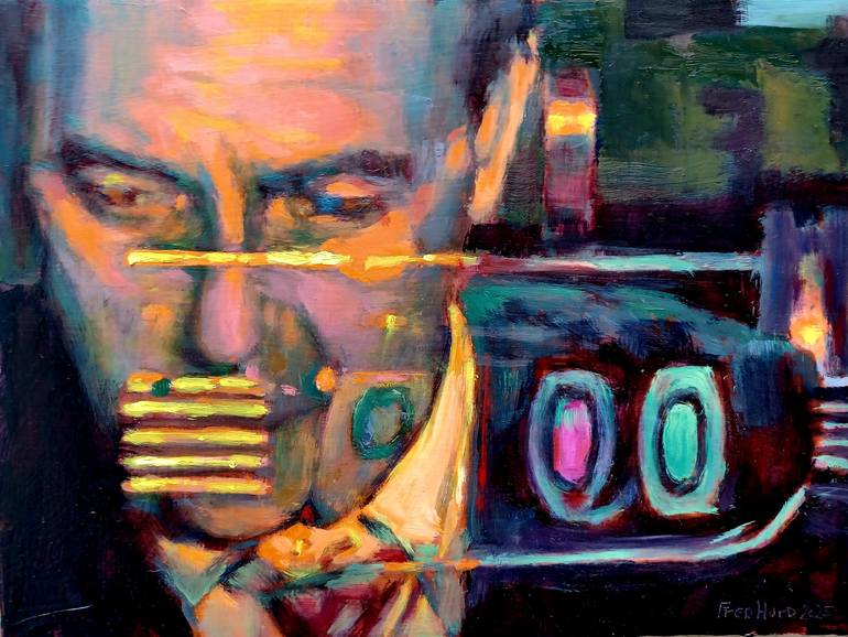 "Clock / Face." A captivating exploration of time and identity, this original oil painting on wood merges the face of actor Paul Henreid with the stark imagery of a clock. The artist draws inspiration from the film noir, "The Scar," also known as "Hollow Triumph" (1948). The artwork employs a monta...